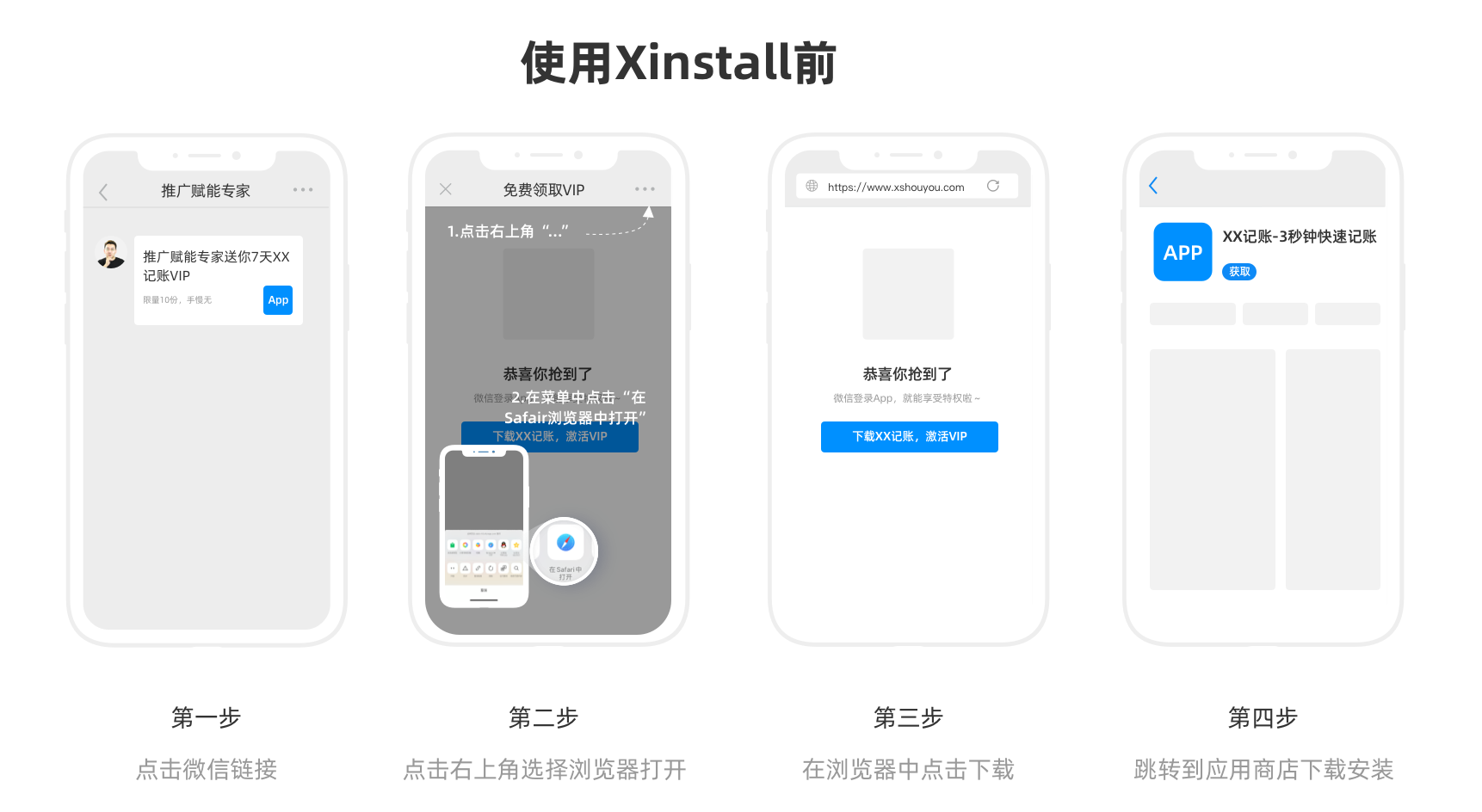 如下图:使用Xinstall前用户需要点击右上角到达safari浏览器才能到达落地页。使用Xinstall后,点击微信分享链接,则可以直接达到App落地页。直接缩短了用户操作成本,使转化率可以直接提升。
