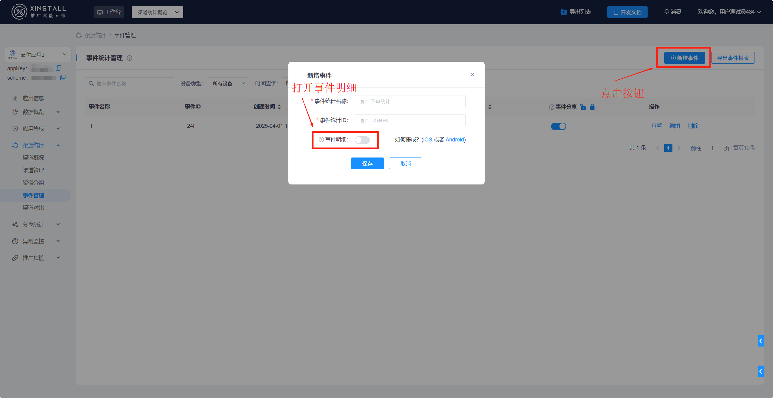 事件统计,主要用来统计终端用户对于某些特殊业务的使用效果,如充值金额,分享次数,广告浏览次数等等。 调用接口前,需要先进入 Xinstall 管理后台事件统计然后点击新增事件。