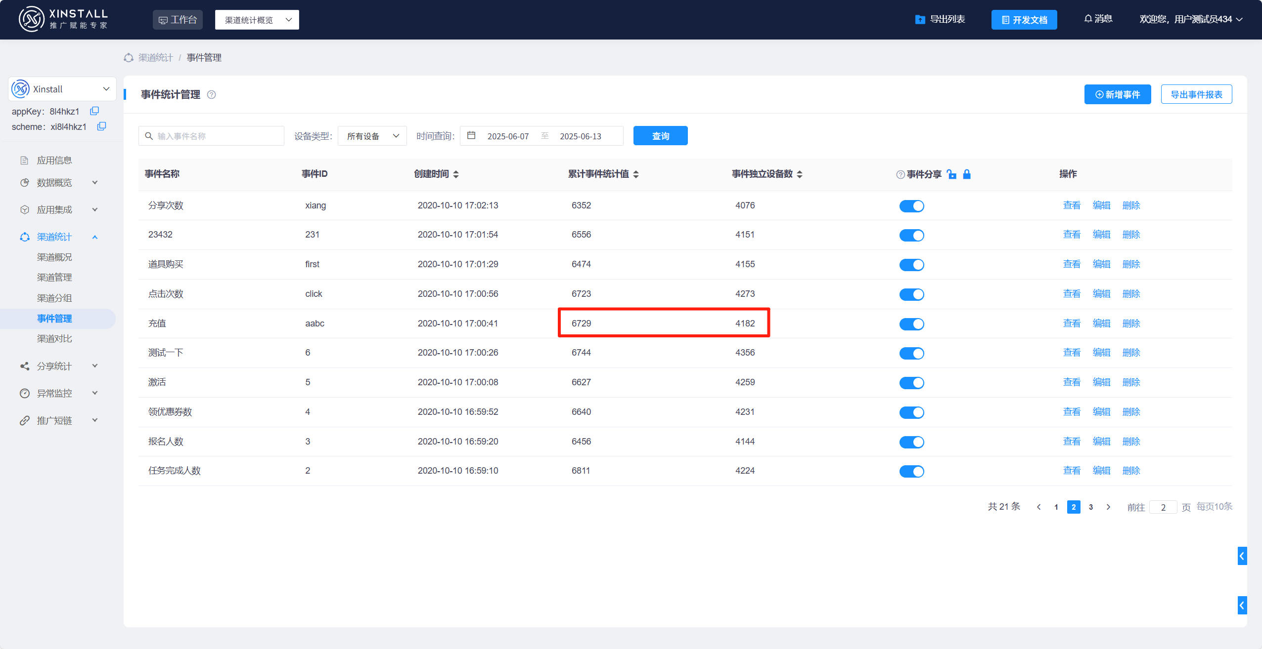 您可以设置不同事件来满足不同的业务场景,如下图所示,您可以设置充值事件,进行上报。就可以统计到总的充值设备数为32个,累积充值金额为364元
